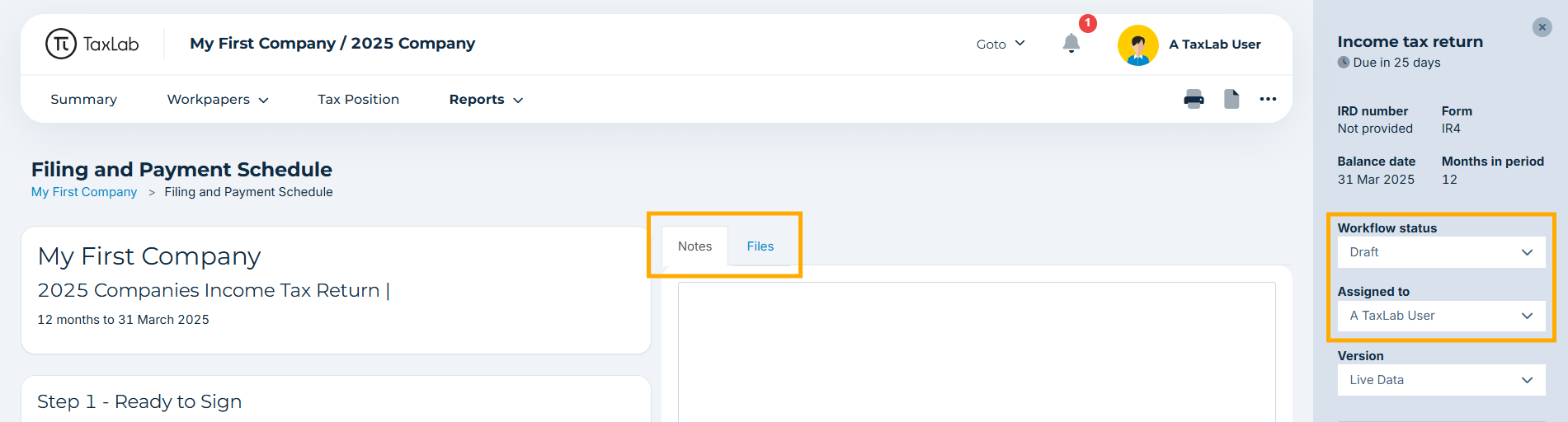 - Task statistics for the selected tax year